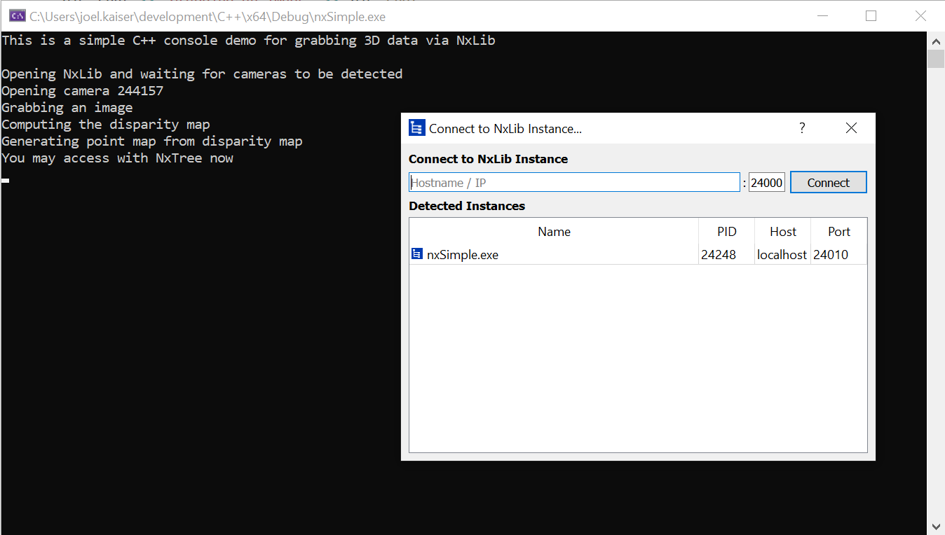 I modified the nxSimple example as below to enforce the usage of my camera with the serial 244157 and additionally added a std::cin.ignore() to prevent the NxLib from finalizing, giving me the possibilty to access the lib on port 24010: