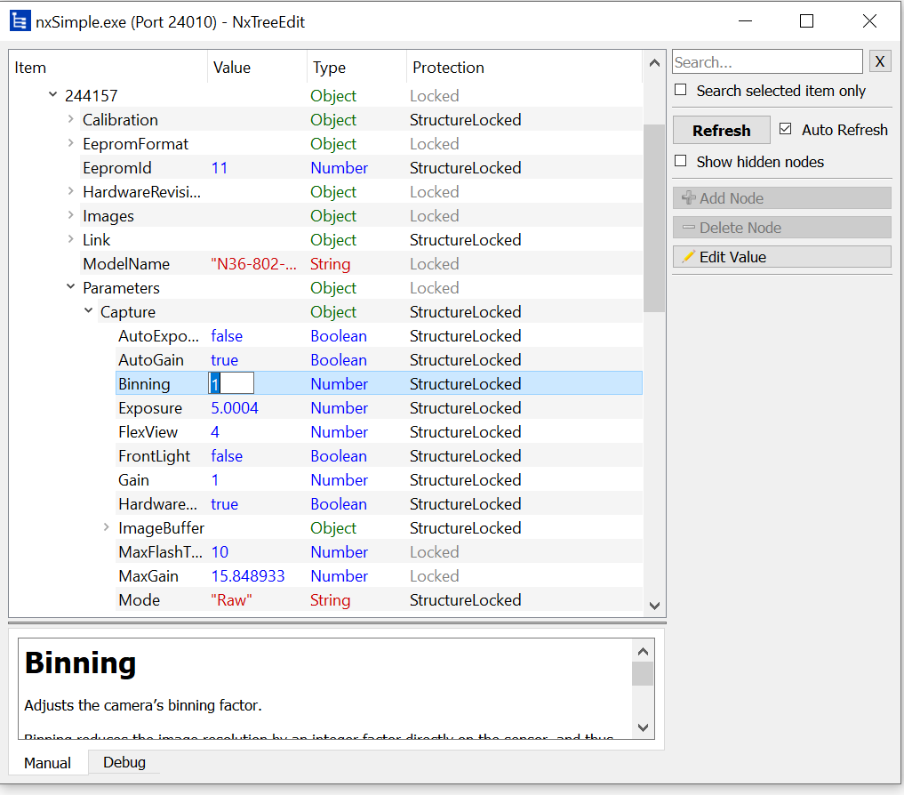 However when they try to access NxTreeEdit from their Apps, they can only access Debug mode. so they cannot access like Binning or Size parameter. (read only mode)
